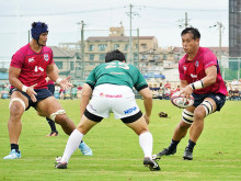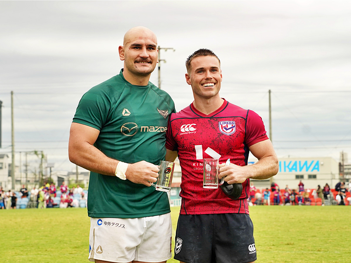 プレーヤー・オブ・ザ・マッチに選ばれたSA広島のテヴィン・フェリス選手と花園近鉄ライナーズのウィル・ハリソン選手