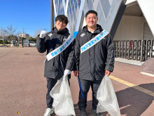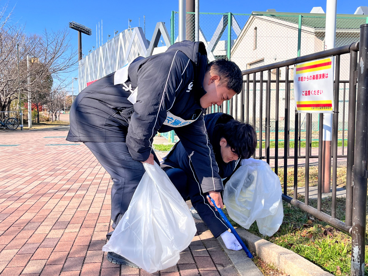 花園ラグビー場周辺でゴミ拾いをする花園近鉄ライナーズの河村謙尚選手と高橋虎太郎選手