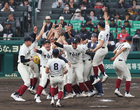 第98回選抜高校野球大会最終日は31日、甲子園球場で決勝が行われ、大阪桐蔭(大阪)が智弁学園(奈良)を7―3で振り切り、4年ぶり5度目の優勝を果たした。 【時事通信社】