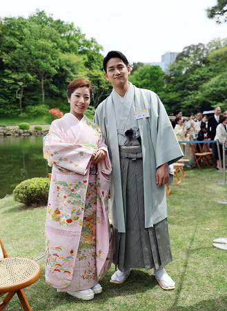 春の園遊会に招かれたフィギュアスケートの三浦璃来さん(左)と木原龍一さん=17日、東京・元赤坂の赤坂御苑(代表撮影) 【時事通信社】
