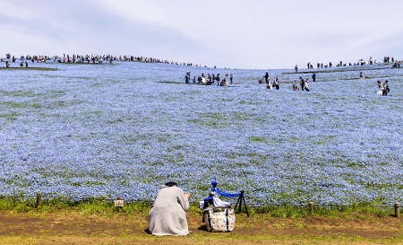国営ひたち海浜公園(茨城県ひたちなか市)のネモフィラが満開となり、大勢の人でにぎわっている。4.2ヘクタールに530万本が咲き誇り、まるで瑠璃色のじゅうたんのよう。見頃は今月末まで=17日 【時事通信社】