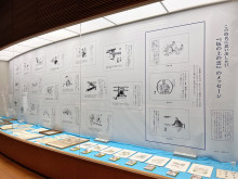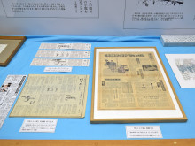 展示ケース壁面では、同作から登場人物の行動や言動からメッセージ性を感じられる部分を引用し、下高原健二さんの挿絵とともに掲示。同作に関する資料では、司馬さんが書いた3通りの題字や、1999(平成11)年に刊行された文庫本新装版の装幀画、連載第54回「騎兵(一)」「あとがき(一)」自筆原稿、新聞1面全体を使った連載予告などが並ぶ。