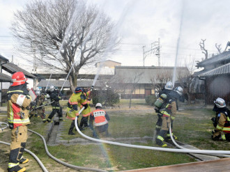 「文化財防火デー」を前に1月20日、国史跡の鴻池新田会所(東大阪市鴻池元町)で消防訓練が行われた。