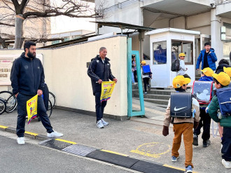 ジャパンラグビーリーグワン「花園近鉄ライナーズ」(以下、ライナーズ)の選手とスタッフが1月16日、小学児童の登校見守り活動「ライナーズスマイル愛ガード運動」に参加した。
