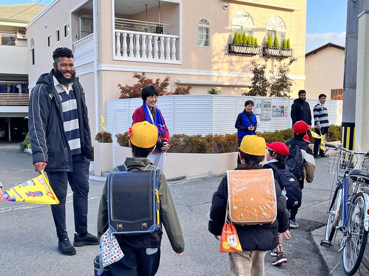 校門前で児童の登校を見守るアキラ・イオアネ選手と菅原貴人選手