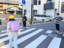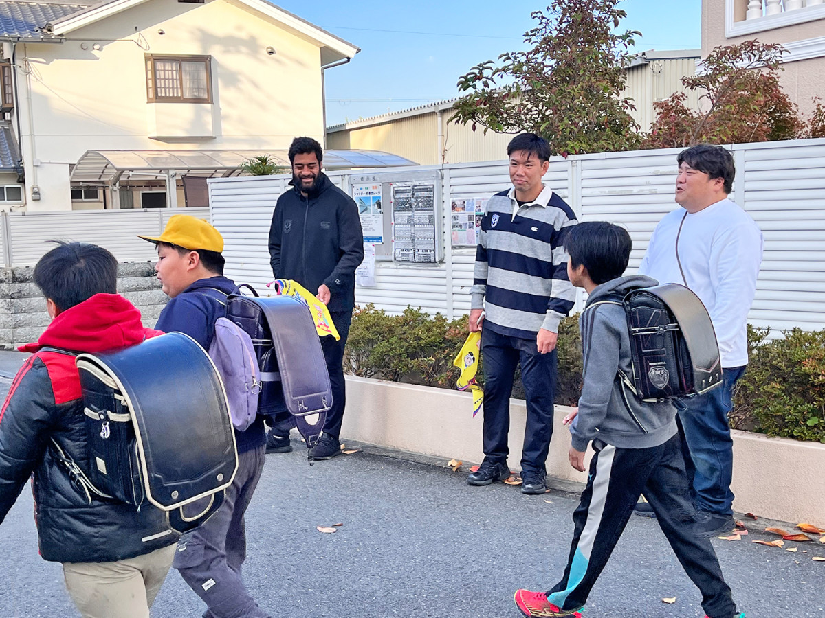 ジャパンラグビーリーグワン「花園近鉄ライナーズ」(以下、ライナーズ)の選手とスタッフが11月28日、小学児童の登校見守り活動「ライナーズスマイル愛ガード運動」に参加した。