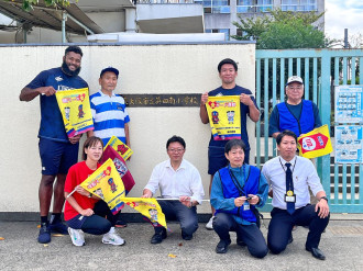 ジャパンラグビーリーグワン「花園近鉄ライナーズ」(以下、ライナーズ)の選手とスタッフが10月10日、小学生の登校見守り活動「スマイル愛ガード運動」に参加した。