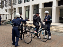 傘を差し、イヤホンを使っていた学生に指導する警察官