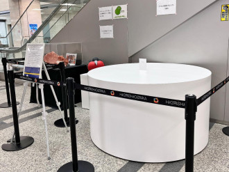 東大阪市役所本庁舎1階で10月31日、大阪・関西万博のナウル共和国パビリオンで使われた展示台「ナウル台座」などの展示が始まった。
