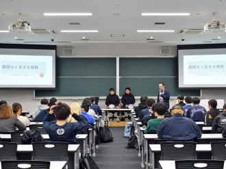 ジャパンラグビーリーグワン「花園近鉄ライナーズ」の2選手が10月28日、近畿大学(東大阪市小若江3)法学部で行われた共通教養科目「国際化と異文化理解」講義に登壇した。