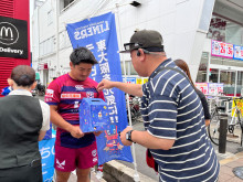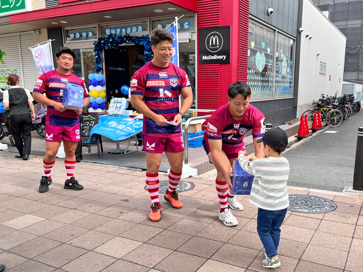 ジャパンラグビーリーグワン「花園近鉄ライナーズ」の選手が10月19日、マクドナルド近鉄東花園駅前店(東大阪市吉田6)店頭で「青いマックの日」募金活動に参加した。
