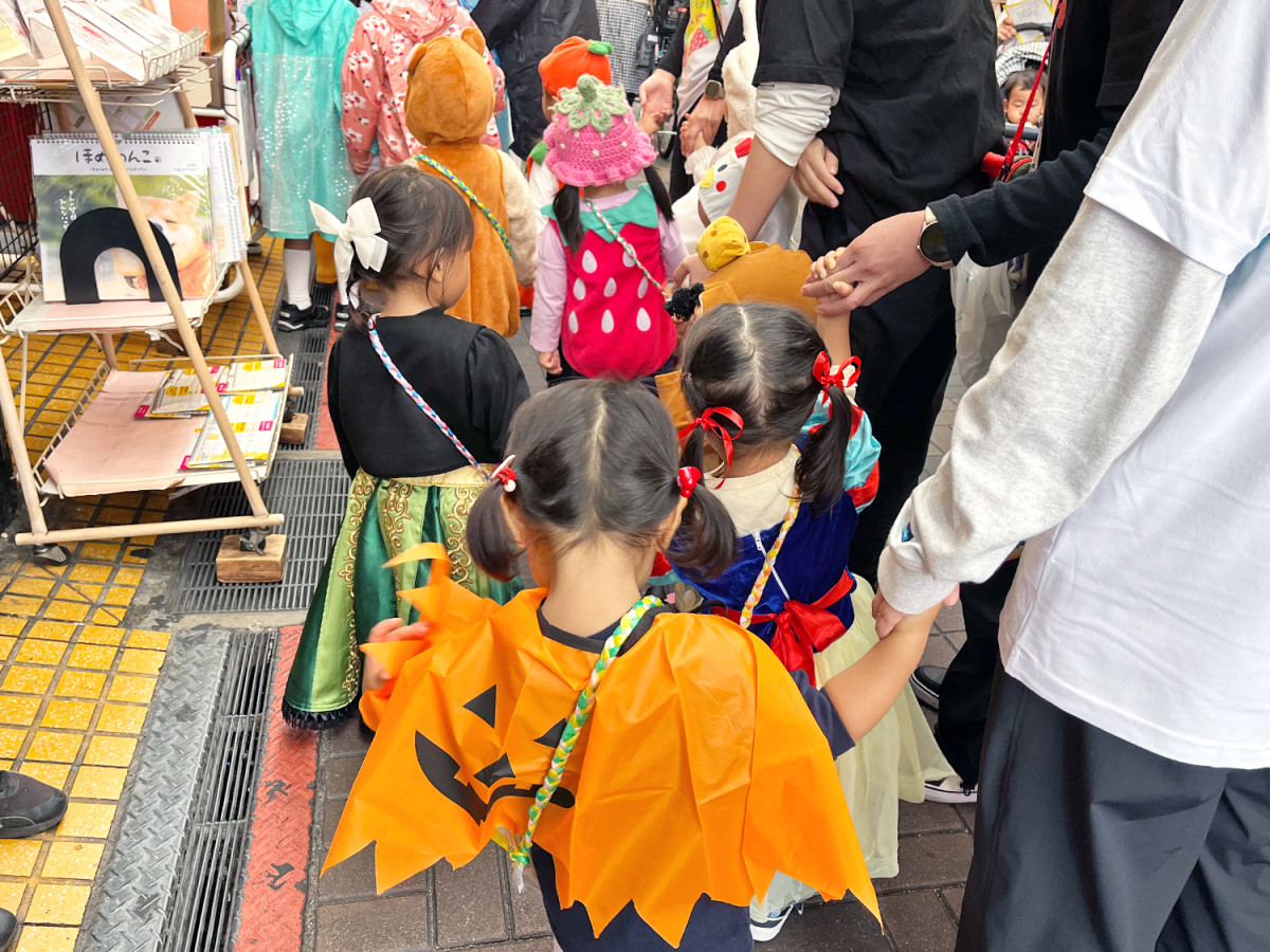 仮装した園児らが商店街を歩く