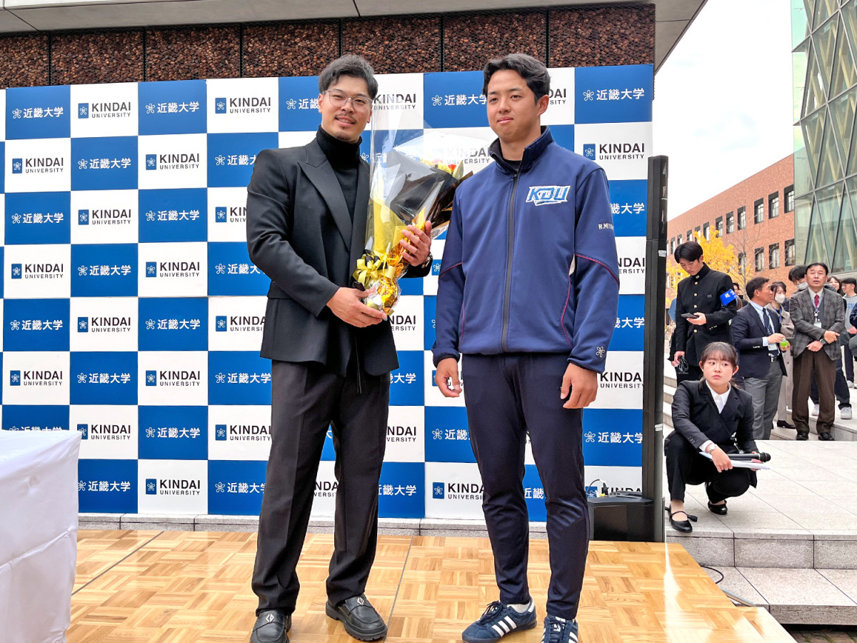阪神タイガースの佐藤輝明選手が12月2日、母校の近畿大学(東大阪市小若江3)で行われたセ・リーグMVP受賞記念セレモニーに出席した。