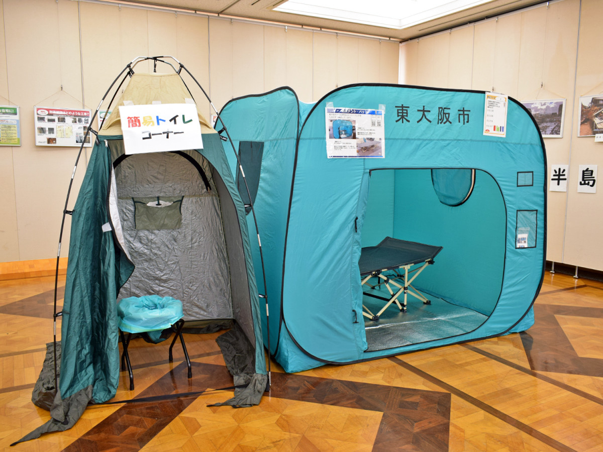 東大阪市役所本庁舎1階多目的ホールで1月15日、防災パネル展が行われた。東大阪市が備蓄する防災テント・ベッド、簡易トイレ