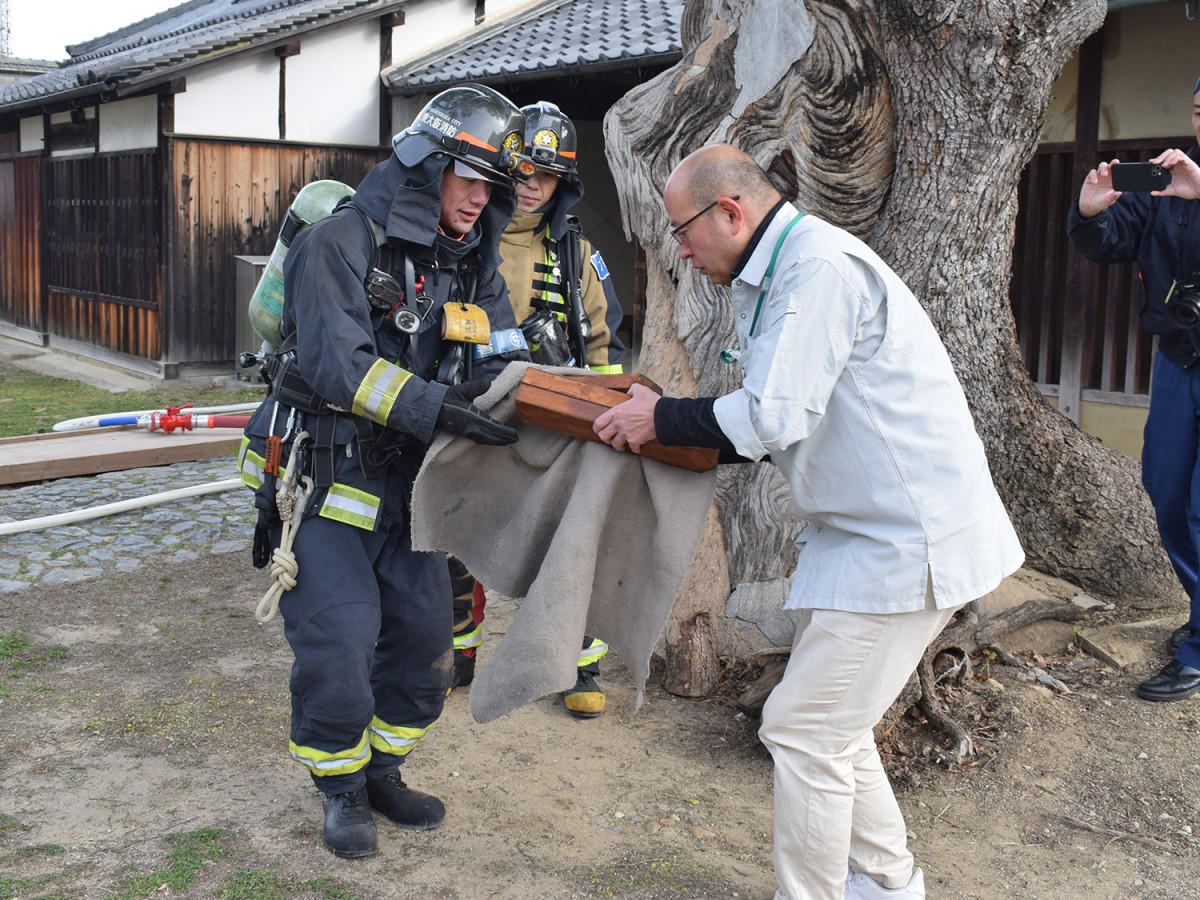 「文化財防火デー」を前に1月20日、国史跡の鴻池新田会所(東大阪市鴻池元町)で消防訓練が行われた。