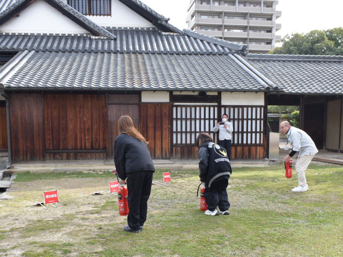 「文化財防火デー」を前に1月20日、国史跡の鴻池新田会所(東大阪市鴻池元町)で消防訓練が行われた。