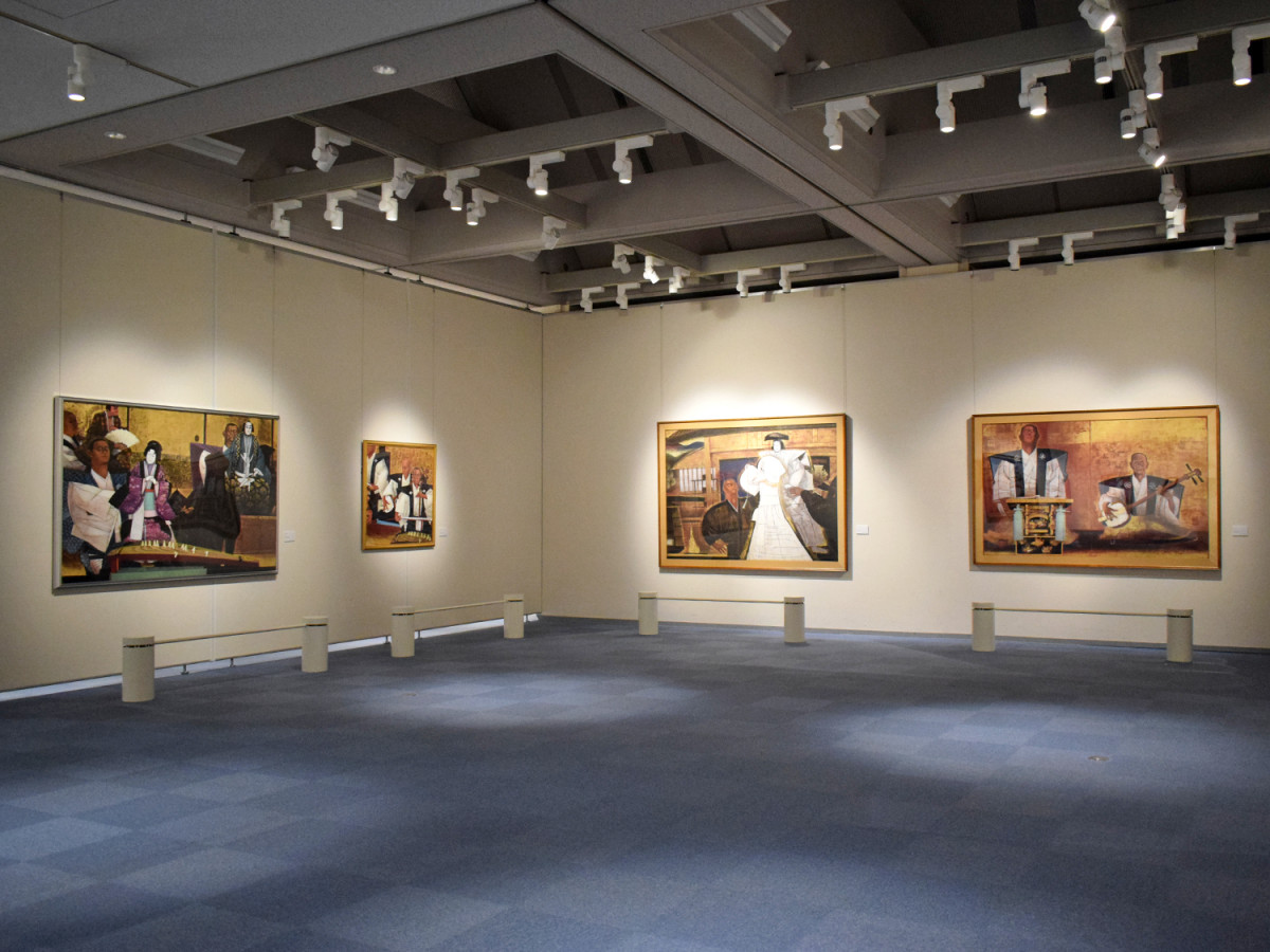 企画展「長谷川青澄展」が2月4日、東大阪市民美術センターで始まった。文楽を題材にした作品を展示するエリアはシアターのような展示空間とした