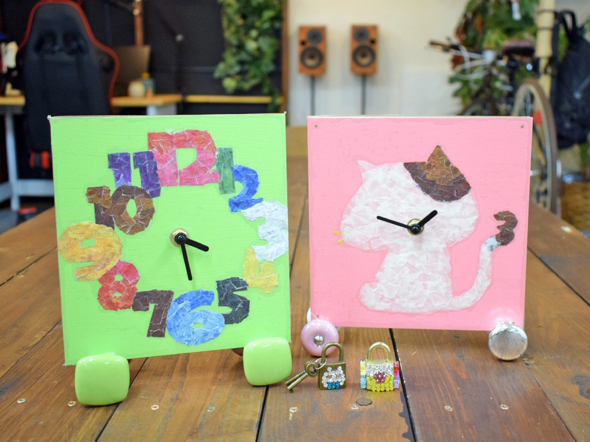 ワークショップで作るマスキングテープちぎり絵時計とデコレーションした南京錠