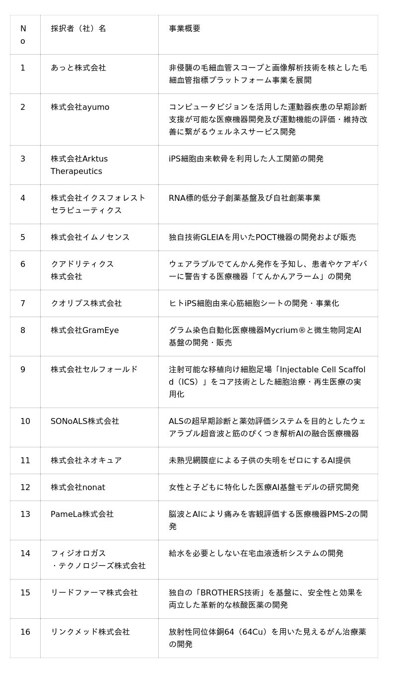 さらに、トークセッションでは、メドテックアクチュエーター合同会社 CEOのBuzz Palmer氏、アストラゼネカ株式会社 執行役員 研究開発本部長 Vikram Chand氏、 一般財団法人 未来医療推進機構 理事長補佐 森口 悠氏に加え、JICベンチャー・グロース・インベストメンツ株式会社 鈴木 はな絵氏が登壇し、スタートアップの成長戦略や国際展開のリアルについて議論を行います。また、約半年間の育成プログラムを経た採択スタートアップ16社がピッチを行い、その中から次フェーズに進出する3社が選抜されます。未来医療の産業化拠点としてのNakanoshima Qrossの機能、そして大阪・中之島からグローバル市場へ挑戦するスタートアップ創出の新たなモデルを、ぜひご取材・ご体感ください。