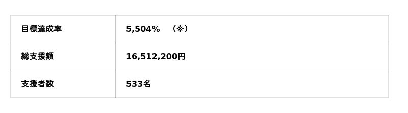 最終的に、目標金額の5,504%(総額16,512,200円)の支援をいただき、533名のサポーターと共にプロジェクトを完走いたしました。