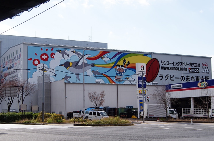 「中学時代の部活は水泳。高校は音楽をしていた」という奥山社長。「生まれと育ちが東大阪やから、授業でラグビーはあったという程度しかラグビーとは接していなかった。あまりスポーツは好きじゃない」という。ラグビーを意識しだしたのはサンコーインダストリーの社長になってから。本社は大阪市内だが物流センターは東大阪にあり、「ラグビーのまち東大阪」に触れ、倉庫の壁にラグビー少年をモチーフにした東大阪市のマスコットキャラクター「トライくん」を描いたりし始めた。