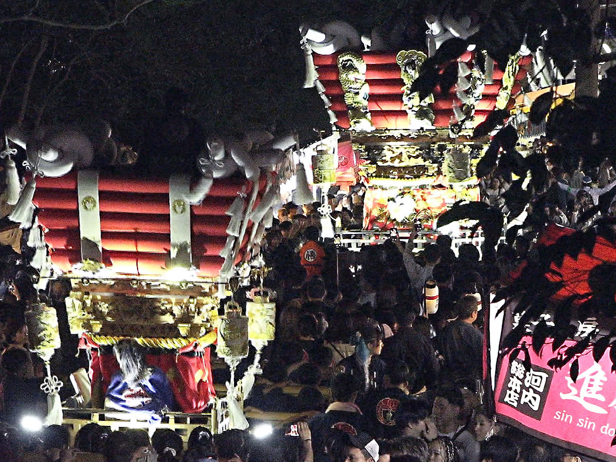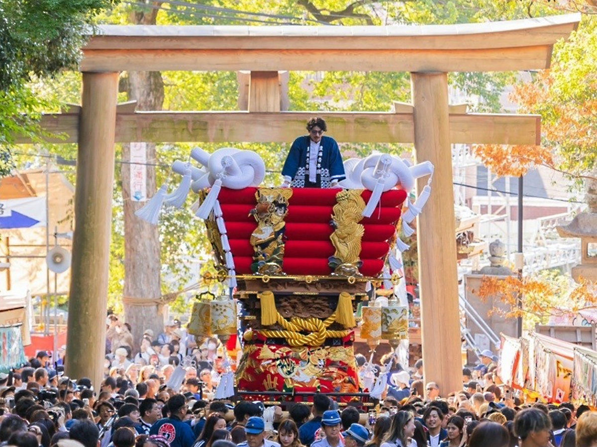 厳かで静寂に包まれる日常の雰囲気とは変わり、祭りの日は約250の露店が軒を連ね、大小合わせて20台以上の朱色の太鼓台が太鼓を鳴らしながら順に宮入りします。重さ約1.5トンの太鼓台が見物客をかき分け、勇壮に往復する様子は圧倒的な迫力があり、圧巻!太鼓台と見物客の距離が近いのも魅力です。